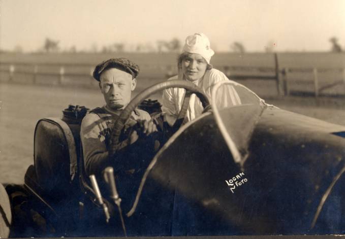 Bill Pruett, mechanic and Ruth Wightman, driver, Stockton races, 1918, Mercer, no. 4, pole position.