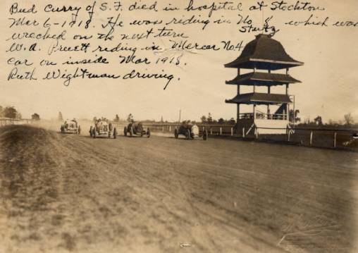 Nina Vitagiliano, determined to win, hit the turn at 80 miles an hour and the Stutz blew a front tire and careened into the field, hitting a ditch and somersaulting between two trees. Nina was killed and the mechanic Her mechanic R. N. "Bud" Curry of San Francisco, was severely injured with a cracked skull and died two days later, March 6, 1918..